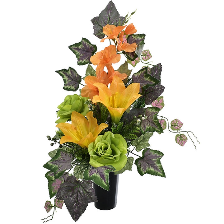 Elegancka kompozycja ze sztucznych kwiatów, w której dominują pomarańczowe lilie, jasnozielone róże oraz intensywne akcenty liści winorośli, tworzy wyjątkowy i wyrazisty układ florystyczny.