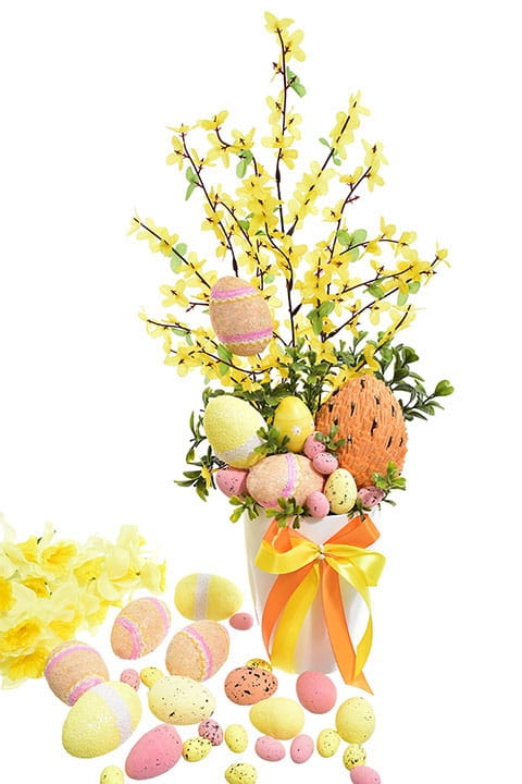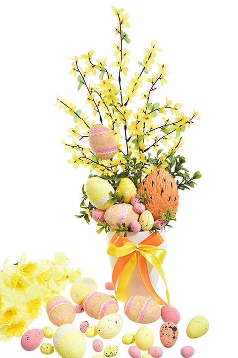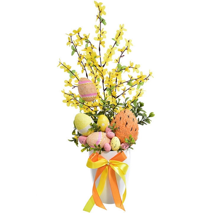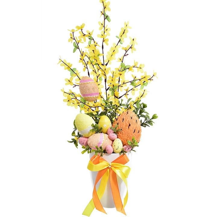STROIK WIELKANOCNY JAJKA KOMPOZYCJA SZTUCZNYCH KWIATÓW W DONICY FORSYCJA 55 CM
