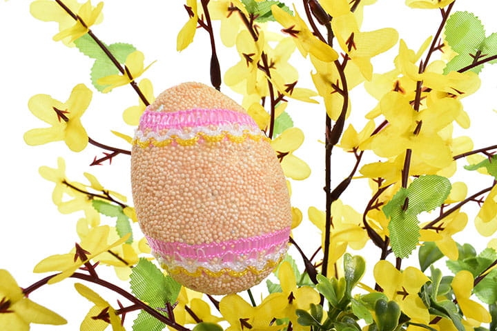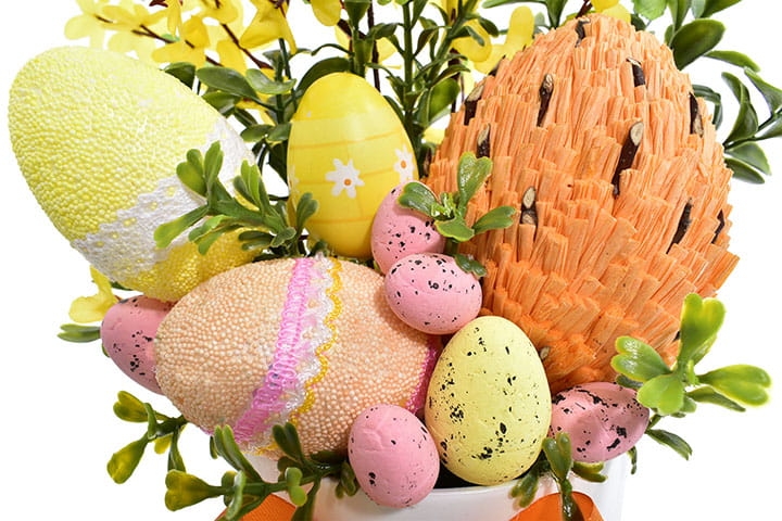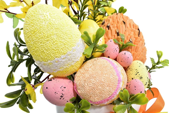 W kompozycji znajdują się styropianowe jajka, które dopełniają całość, nadając jej tradycyjny, wielkanocny charakter.