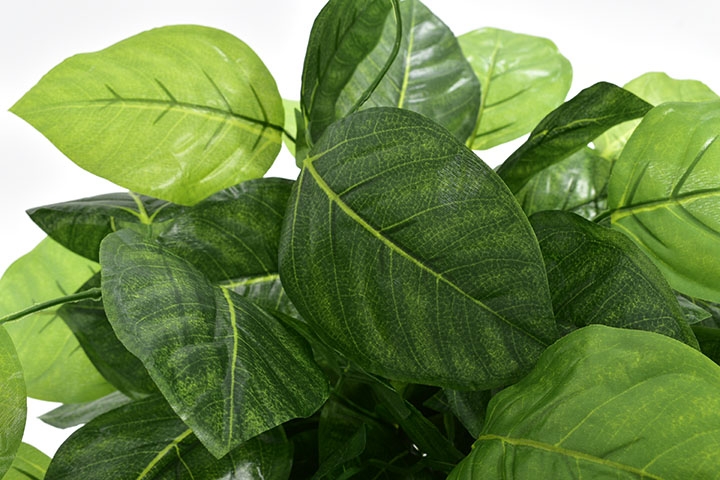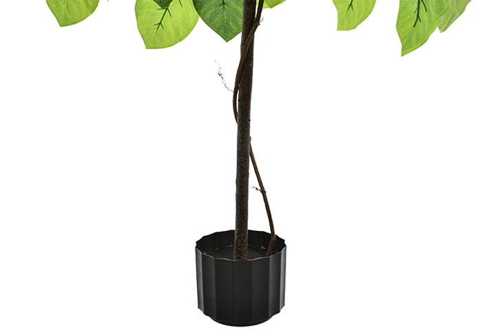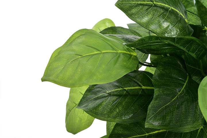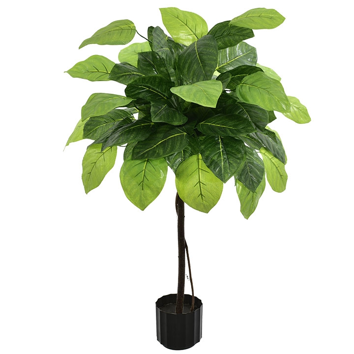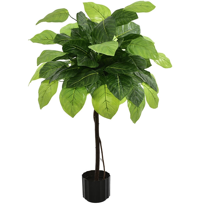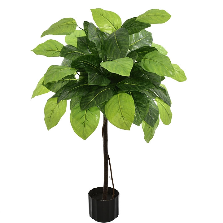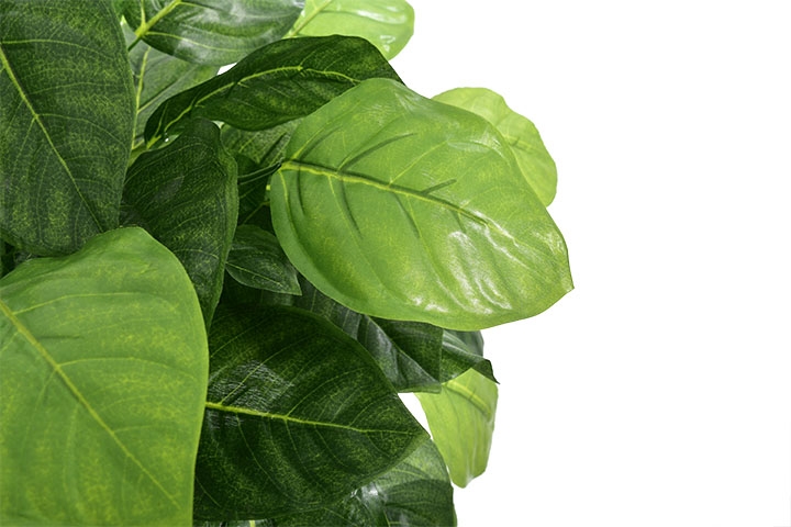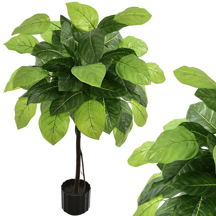 Stylowe sztuczne drzewko o bujnej koronie z dużych, realistycznie odwzorowanych liści w różnych odcieniach zieleni.