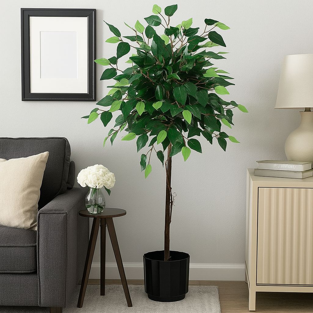 Eleganckie sztuczne drzewko z gęsto osadzonymi, drobnymi liśćmi w odcieniach zieleni to doskonała dekoracja dla każdego wnętrza.