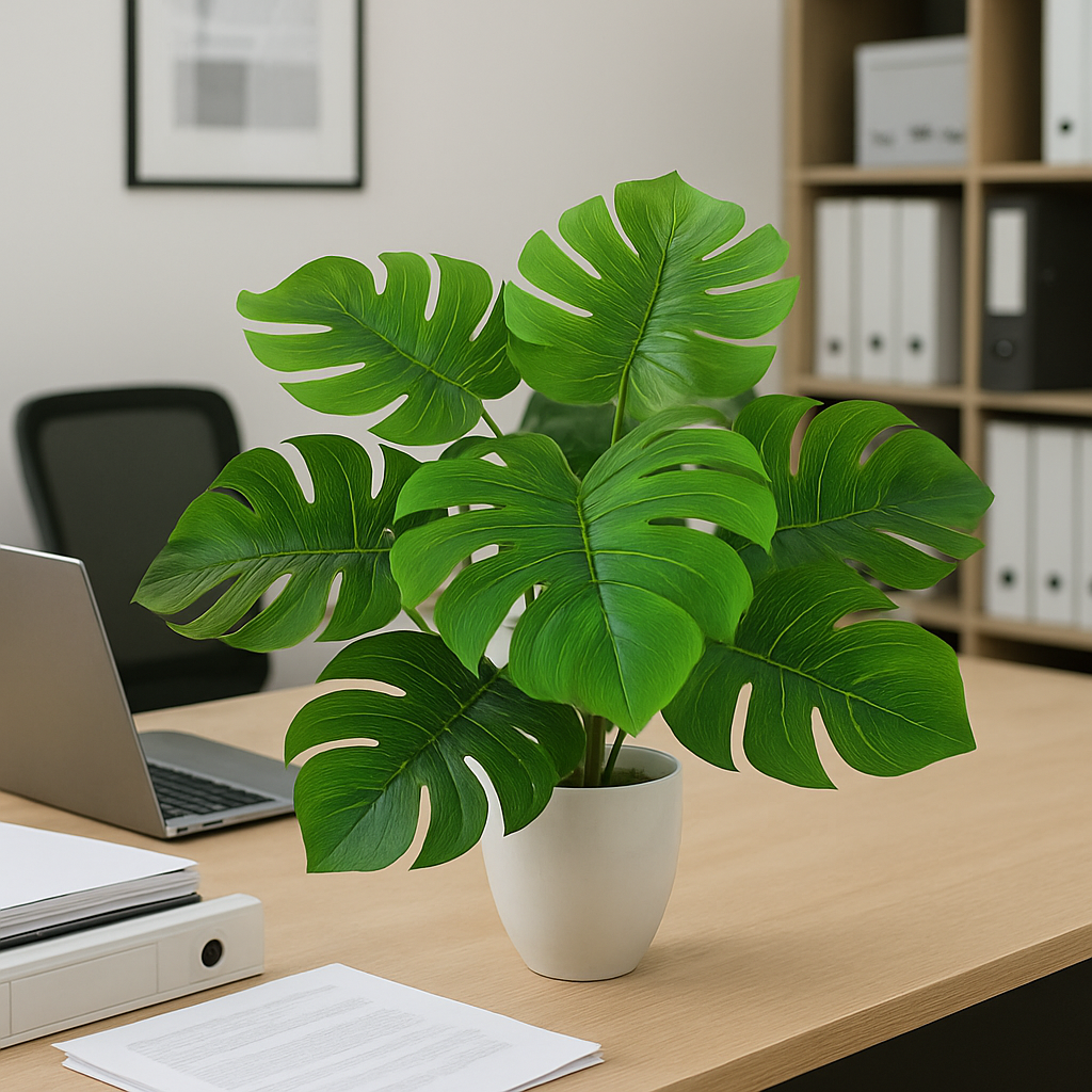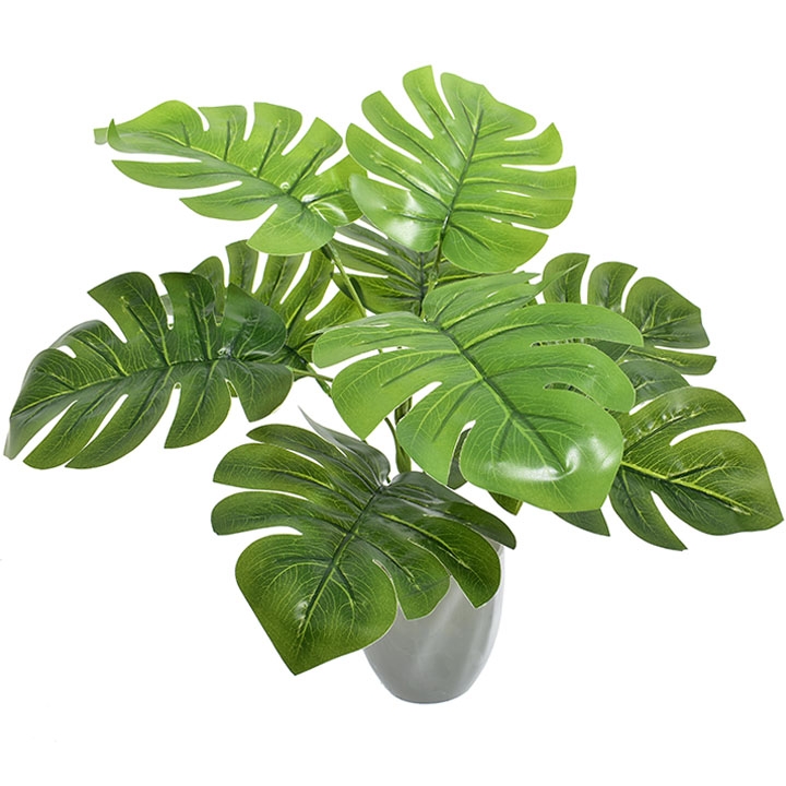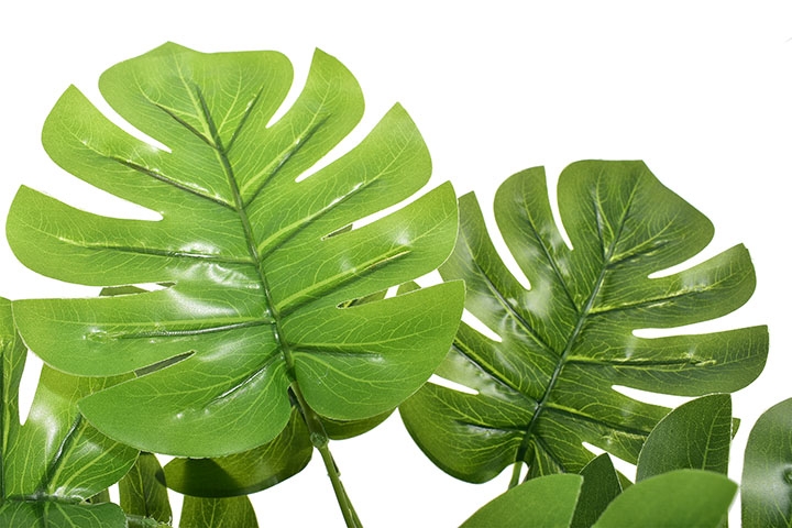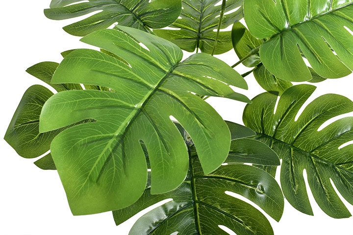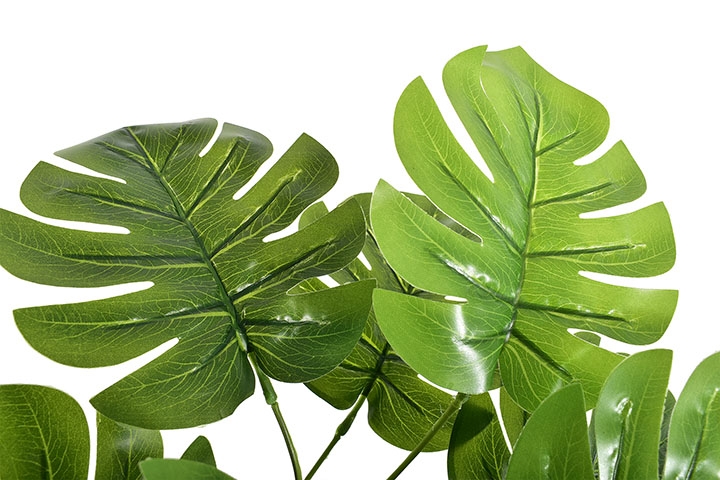 Duże, dziurkowane liście w naturalnych odcieniach zieleni doskonale imitują prawdziwą roślinę.