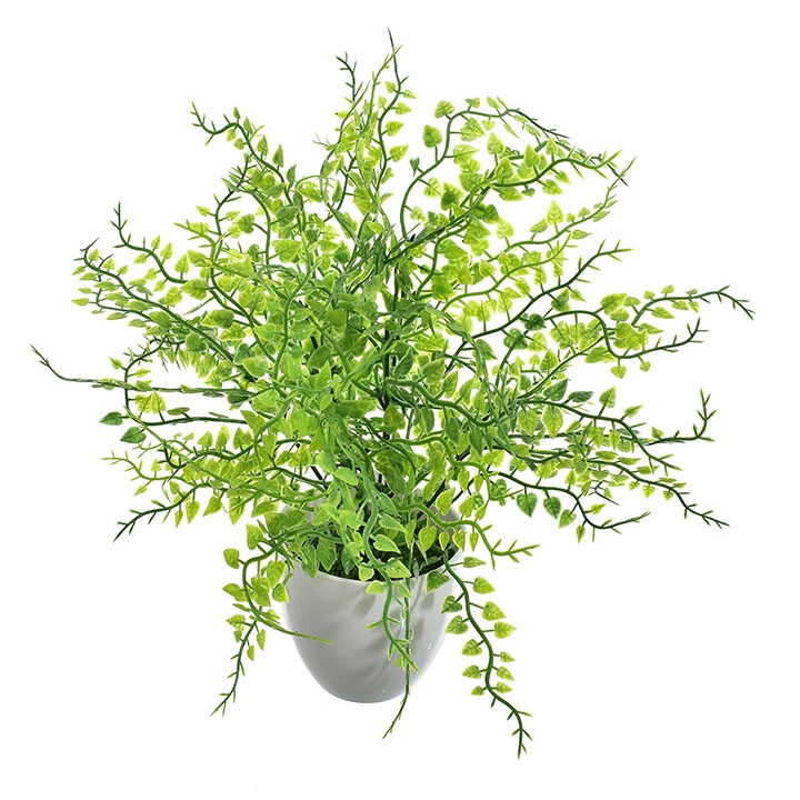 Delikatna, a zarazem efektowna sztuczna roślina o drobnych, jasnozielonych listkach w minimalistycznej, białej doniczce to idealna propozycja dla osób, które pragną wprowadzić do wnętrza subtelną zieleń bez troski o pielęgnację.