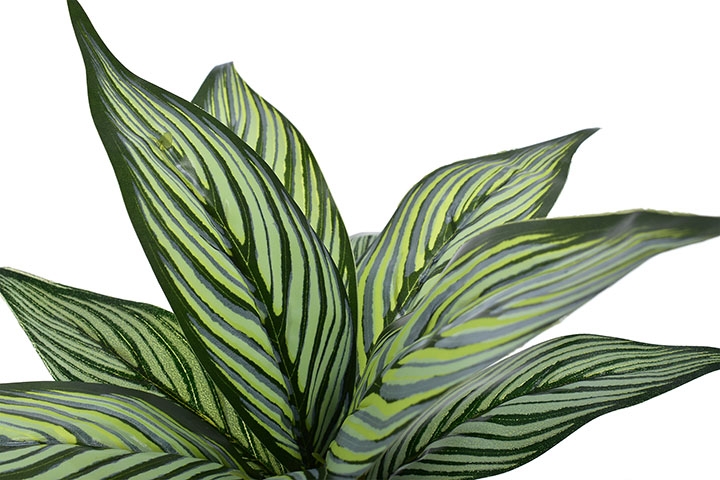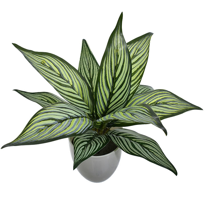 Nowoczesna, sztuczna roślina dekoracyjna o efektownych, paskowanych liściach to idealne rozwiązanie dla osób ceniących estetykę naturalnych roślin bez konieczności ich pielęgnacji.