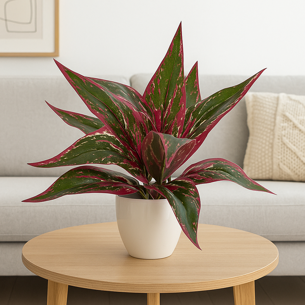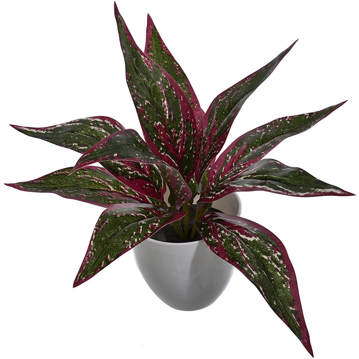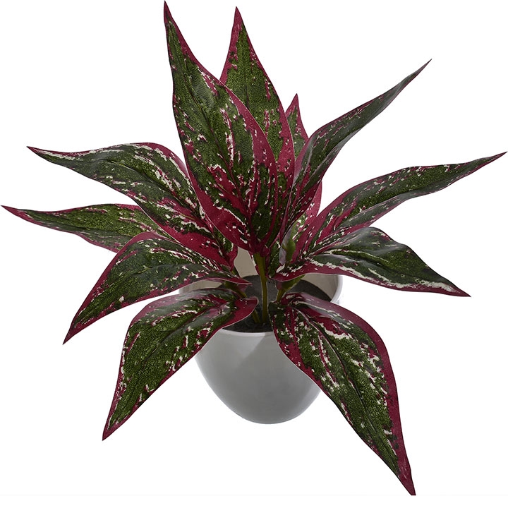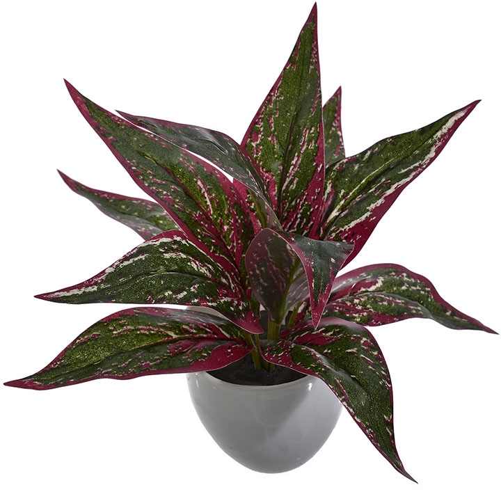 Ta dekoracyjna roślina w białej doniczce przyciąga wzrok intensywnymi kolorami liści – głęboka zieleń przeplata się z czerwienią i jasnymi akcentami, tworząc wyjątkową kompozycję.