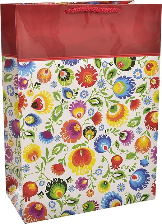 Laminowana torebka prezentowa, zdobiona wzorem.