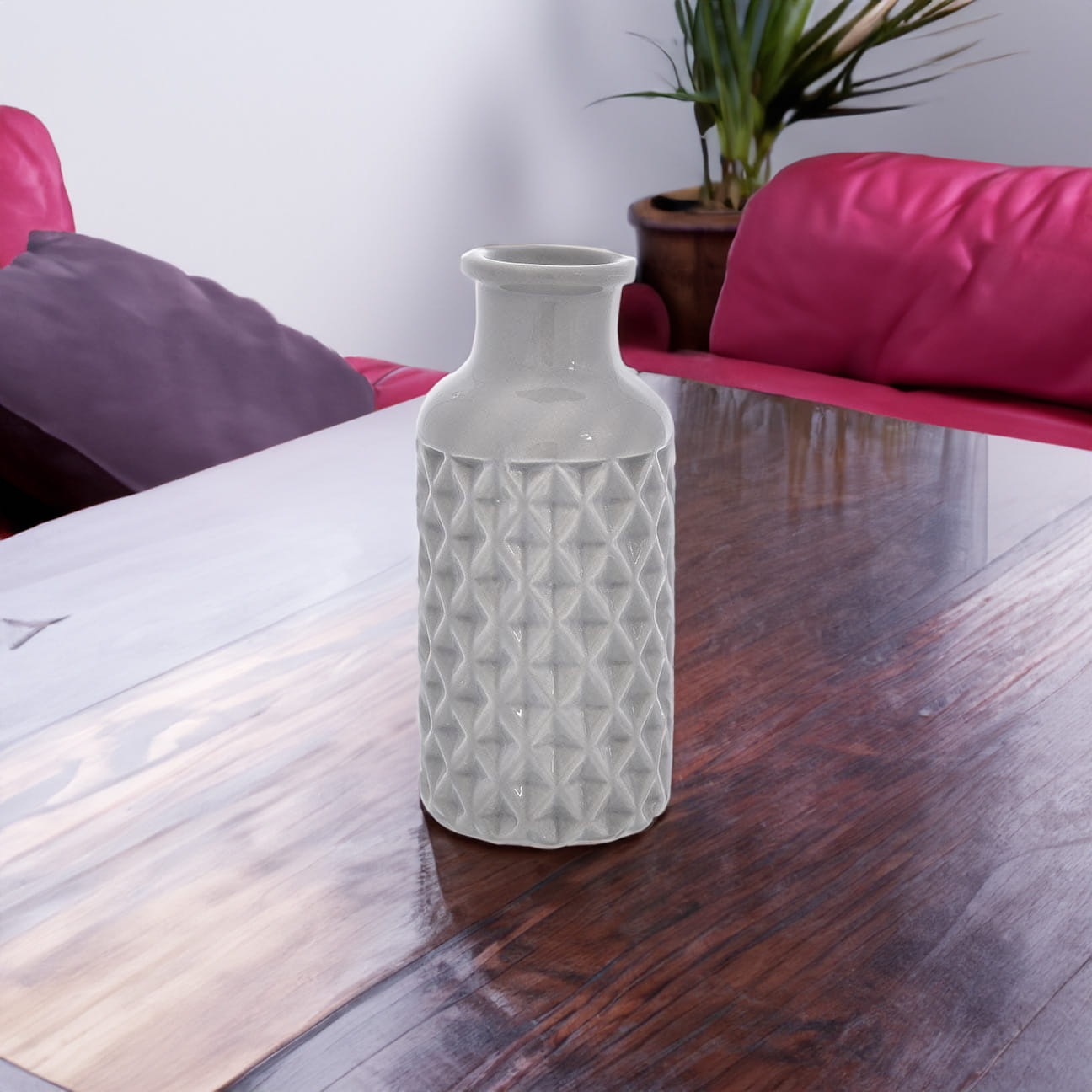 Wykonany z wysokiej jakości ceramiki, szkliwiony, z tłoczonym wzorem w romby.