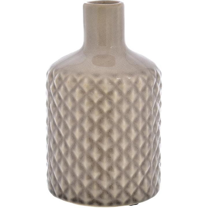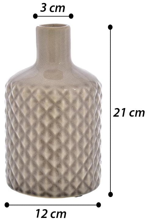 Wykonany z wysokiej jakości ceramiki, szkliwiony, z tłoczonym karbowaniem w kształcie butelki.