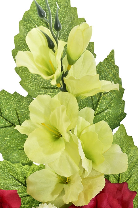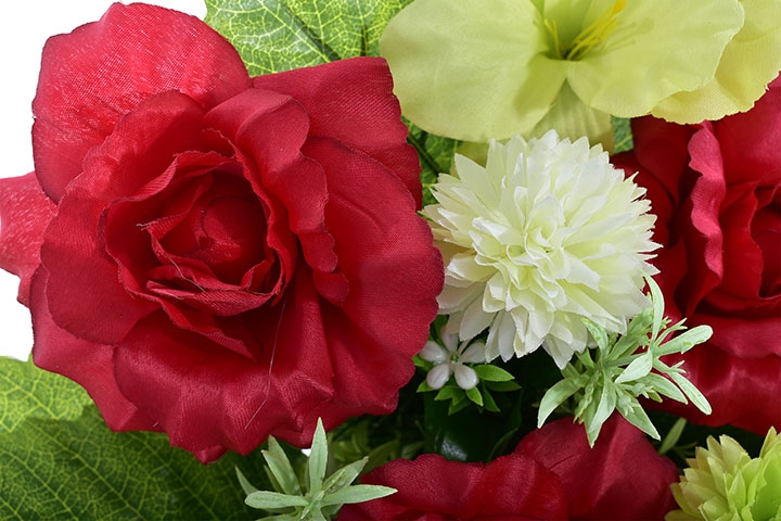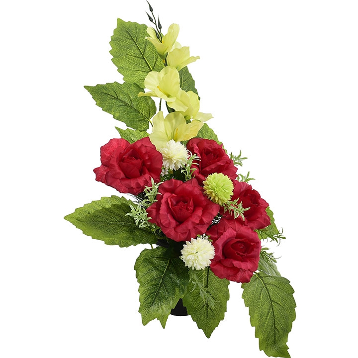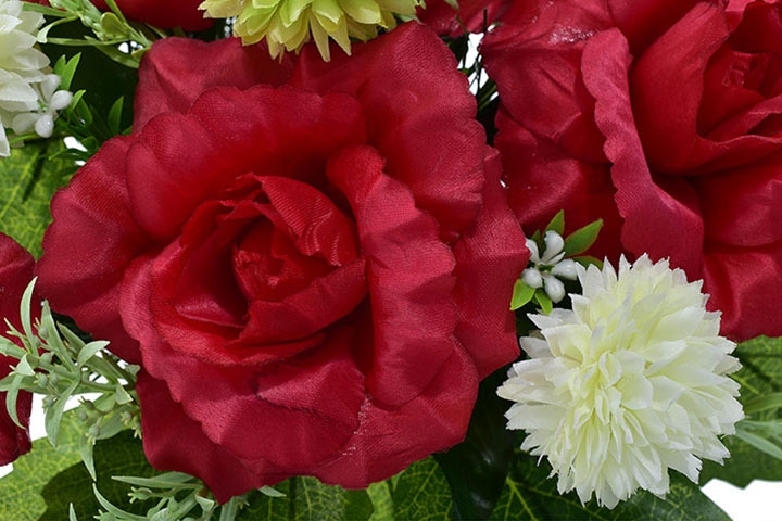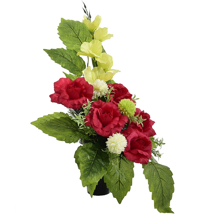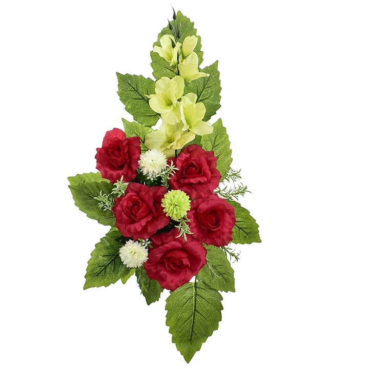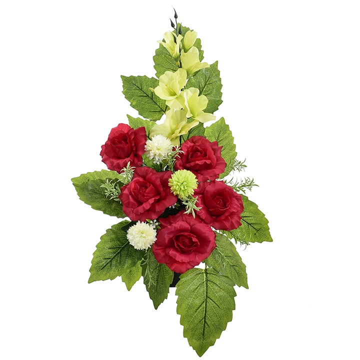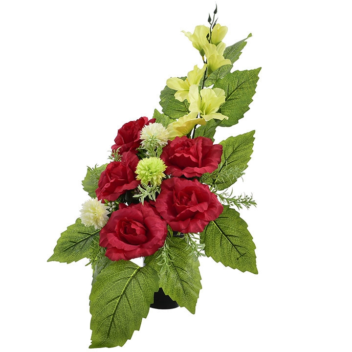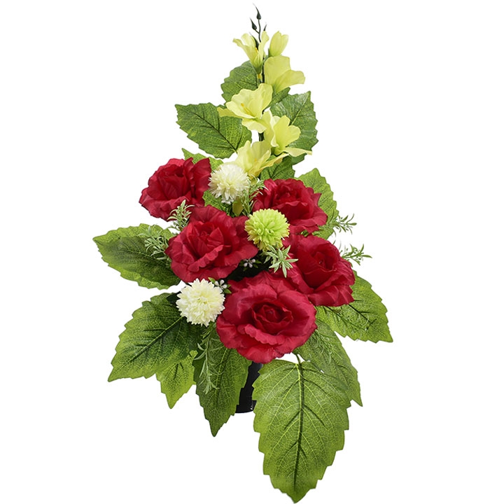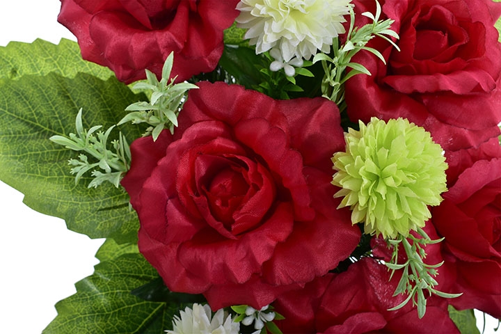 Stylowy wkład florystyczny stworzony z wysokiej jakości sztucznych kwiatów – intensywnie czerwonych róż, jasnych kulistych akcentów oraz delikatnej zieleni – to estetyczne i trwałe rozwiązanie na nagrobek.